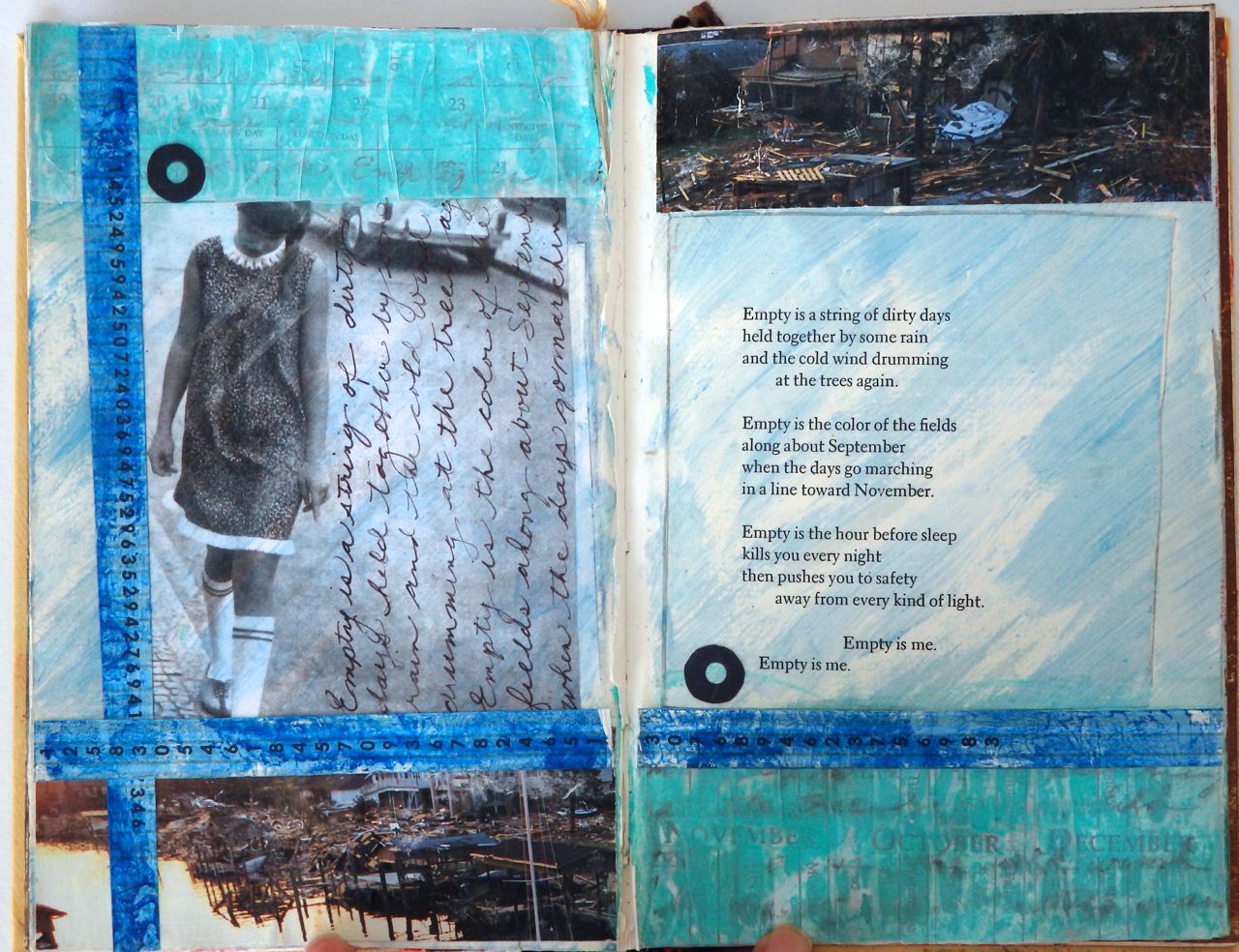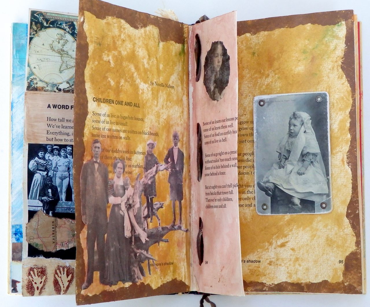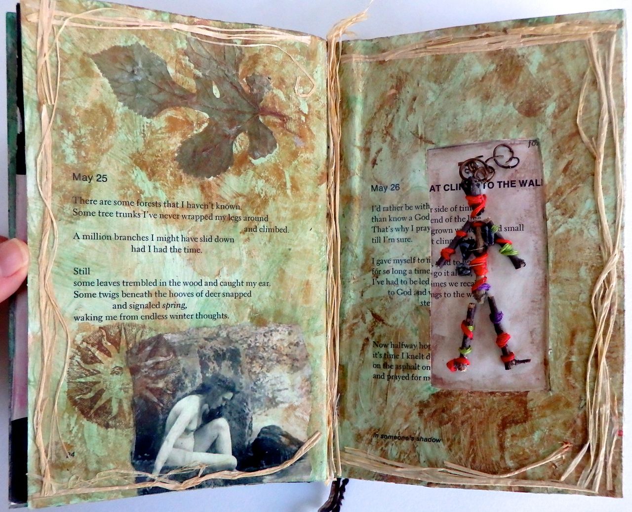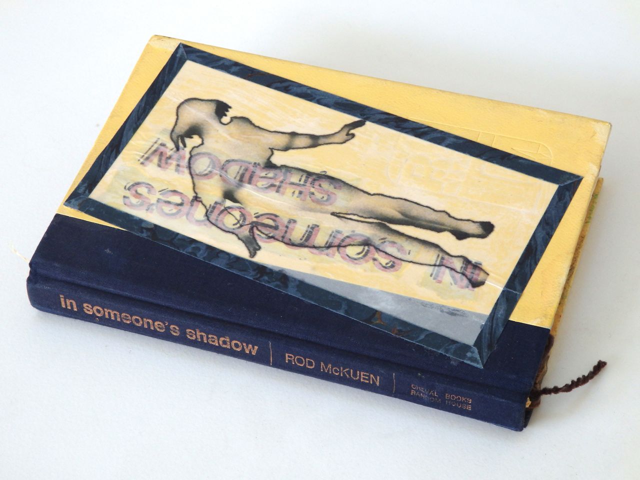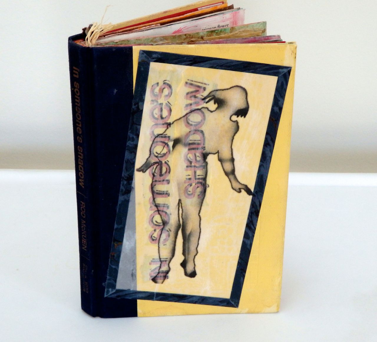 Years ago I picked up a copy of McKuen’s poetry book “In Someone’s Shadow” (1969) at a garage sale. It is an incredibly sad chronicle of loneliness. Using his words as inspiration, I created a mixed-media art altered book, preserving a portion of the original writing on each spread that I used. (Click any image to enlarge)