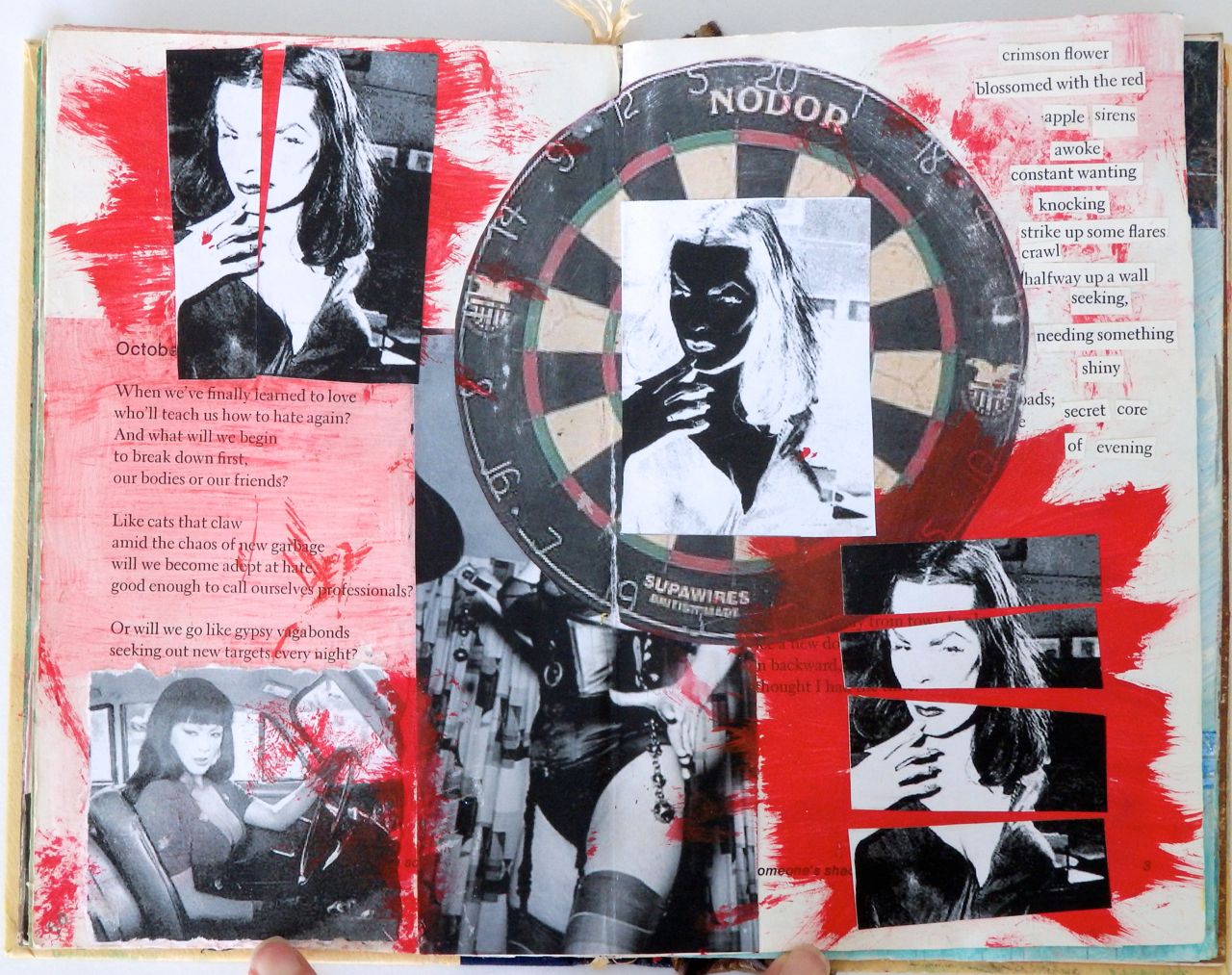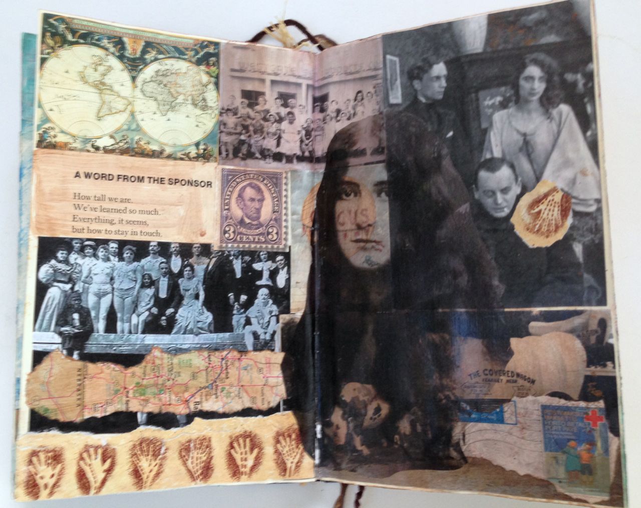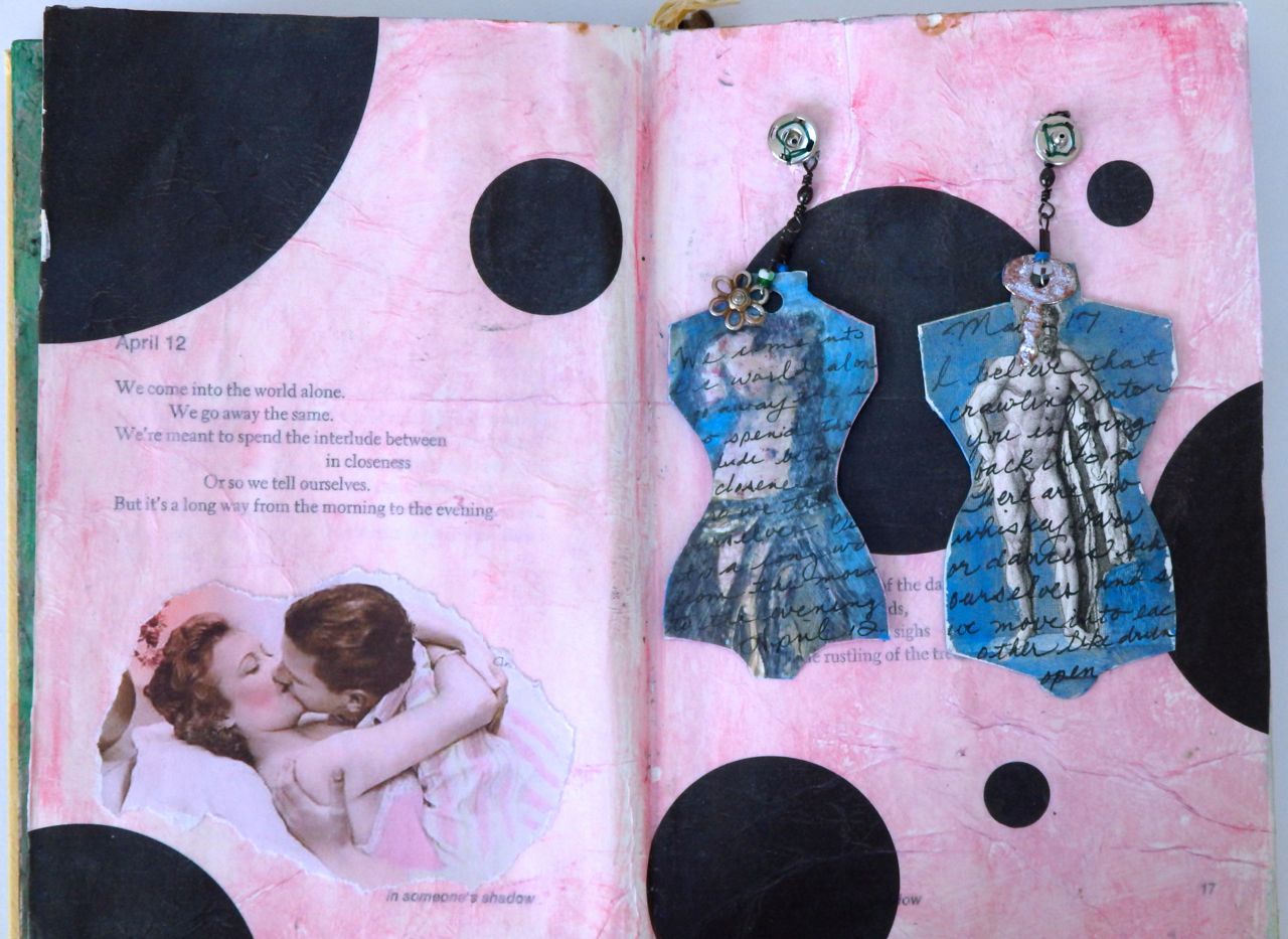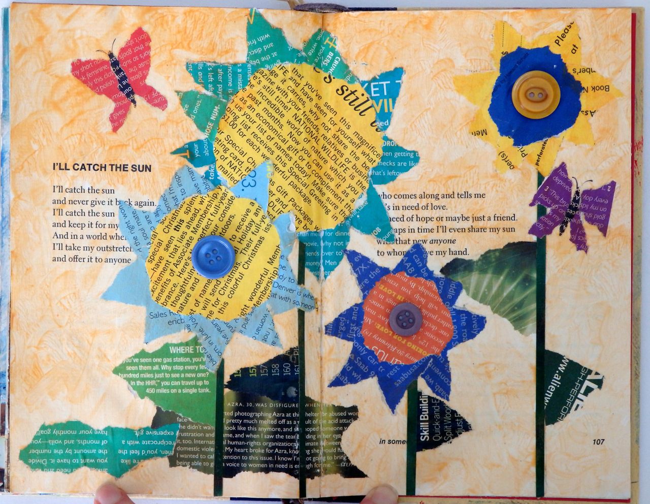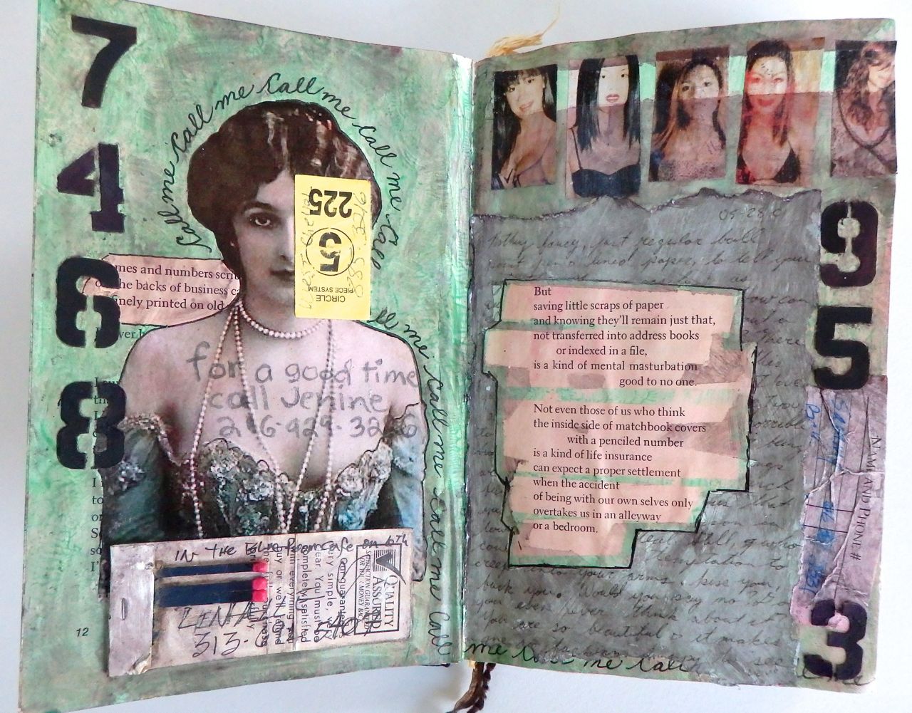 Years ago I picked up a copy of McKuen’s poetry book “In Someone’s Shadow” (1969) at a garage sale. It is an incredibly sad chronicle of loneliness. Using his words as inspiration, I created a mixed-media art altered book, preserving a portion of the original writing on each spread that I used. (Click any image to enlarge)